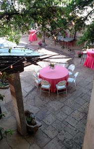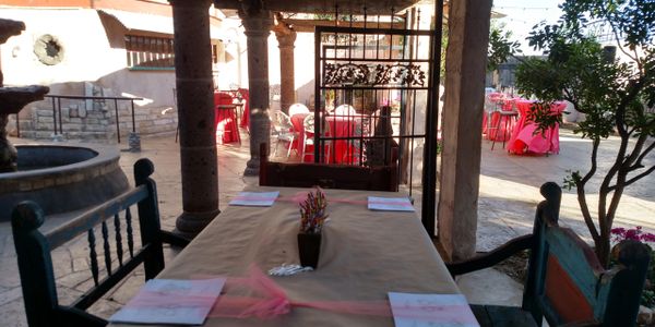 The natural limestone floors inside the hall cover a total interior square footage of 4000 square feet. The primary patio is a spacious 3000 square feet equipped with fountains, a fireplace, party lights, DJ or band set up, and a special area we call "The Chapel," as seen in pictures.